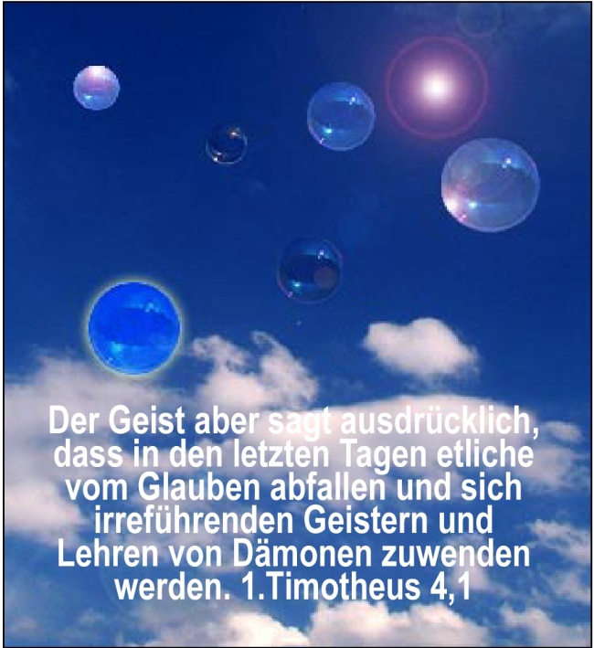 Hierzu warnt 1.Petrus 5,8-9: „Seid nüchtern und wachsam! Denn euer Widersacher, der Teufel, geht umher wie ein brüllender Löwe und sucht, wen er verschlingen kann dem widersteht, fest im Glauben, in dem Wissen, dass sich die gleichen Leiden erfüllen an eurer Bruderschaft, die in der Welt ist"Während ich das Reden der Seifenblasengeister mit anhörte, befand ich mich spürbar unter dieser Wolke. Ich fühlte in diesem Moment eine ungewöhnliche Leichtigkeit, Unnüchternheit und falsche Freiheit wie eine Droge über mir. Es ist eine falsche Salbung welche ihre Opfer in eine ebenso verführerische und falsche Freiheit hineinführt.